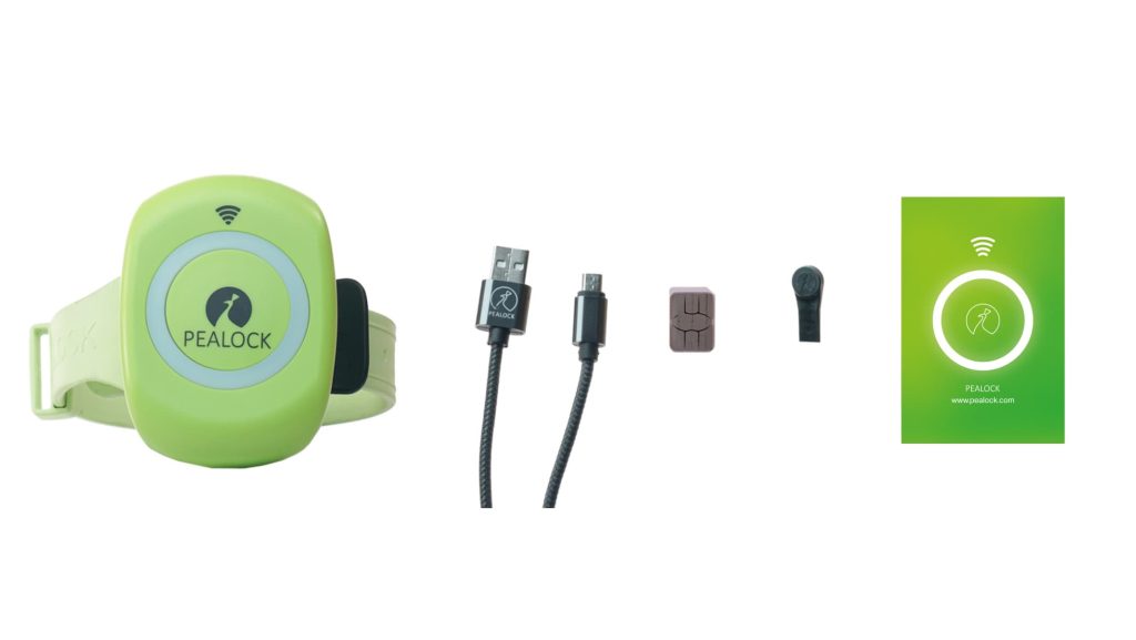 Das Paket umfasst ein smartes Pealock-Schloss inklusive Riemen und Schnalle, eine Bedienungsanleitung, eine NFC-Karte, Werkzeug zum Herausnehmen und einlegen der SIM-Karte und ein USB-Ladekabel.