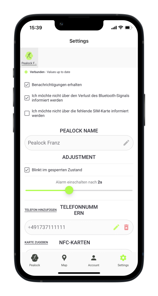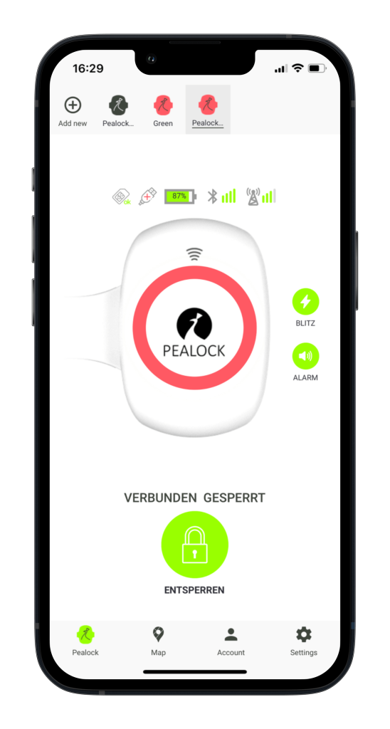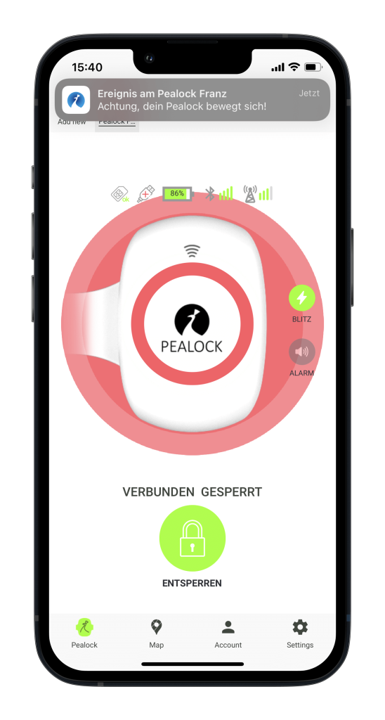 Pealock kann mit einer Smart App oder einem NFC-Gerät verriegelt und entriegelt werden. Über kurze Entfernungen kommuniziert das Schloss per Bluetooth. Sobald Sie sich von ihm entfernen, schaltet es automatisch auf das Mobilfunknetz um. Die SIM-Karte ist ab Werk integriert.