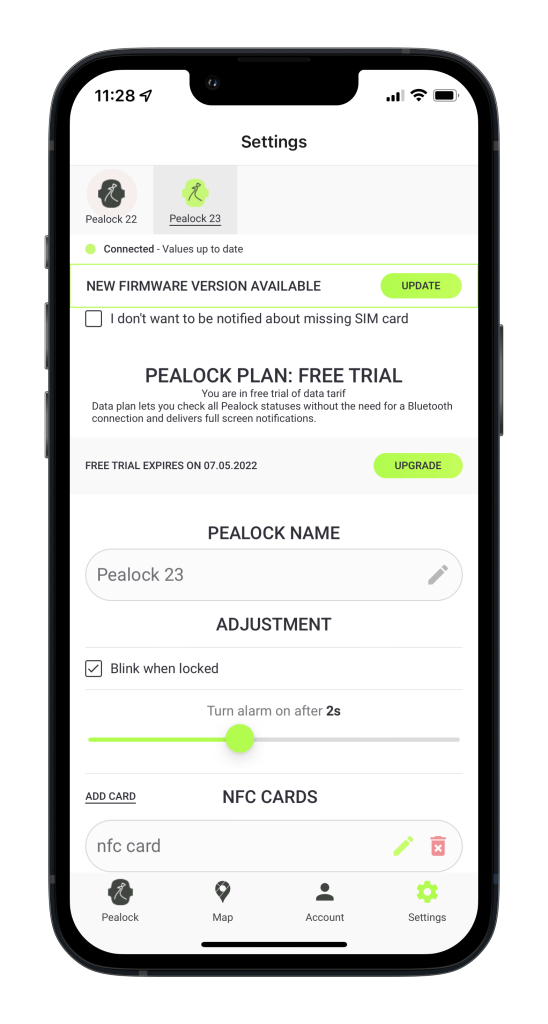 Pealock puede activarse / desactivarse mediante la aplicación móvil o un accesorio NFC. La cerradura se comunica a corta distancia mediante Bluetooth. En cuanto se aleja de la cerradura, ésta cambia automáticamente a la señal GSM. La tarjeta SIM forma parte del candado de fábrica.