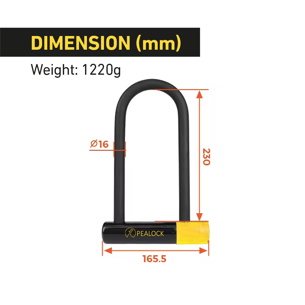 – 230mm length and 1220g weight makes it the ideal size for locking most bicycles and bicycle frames